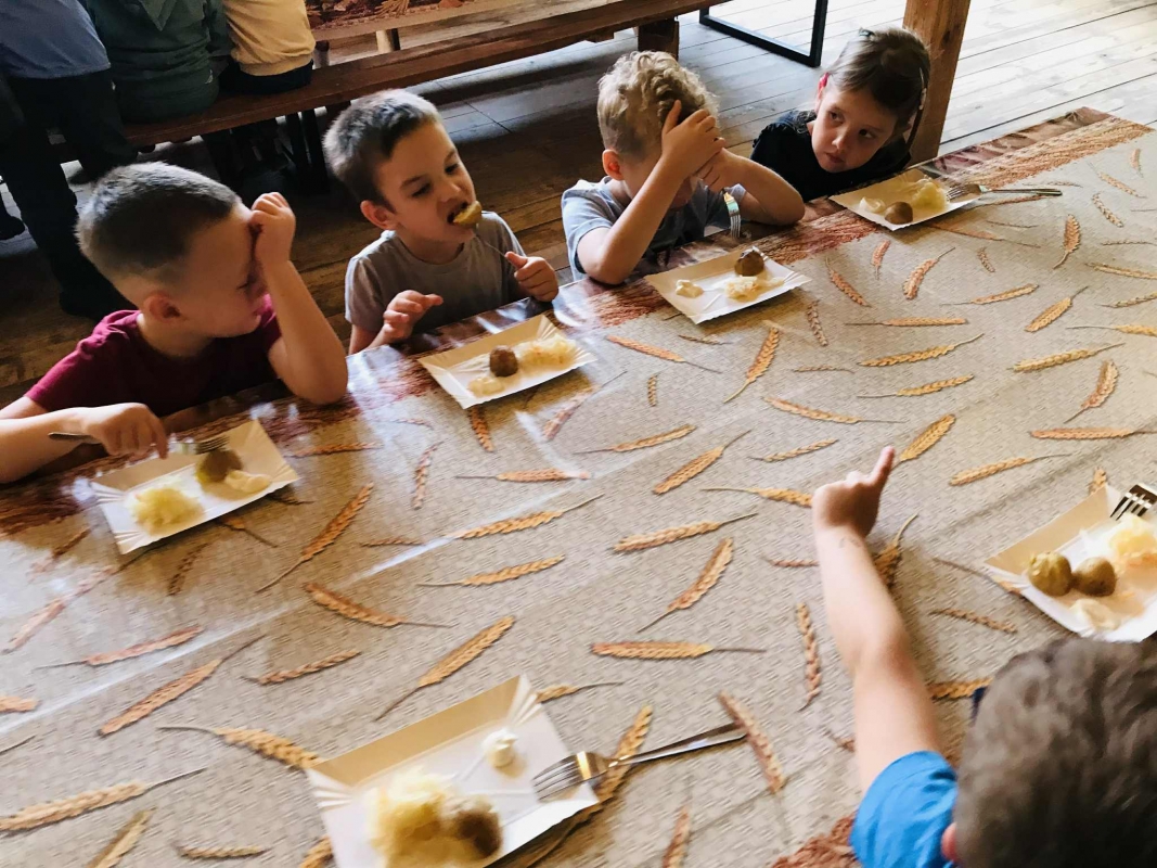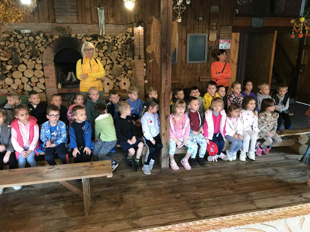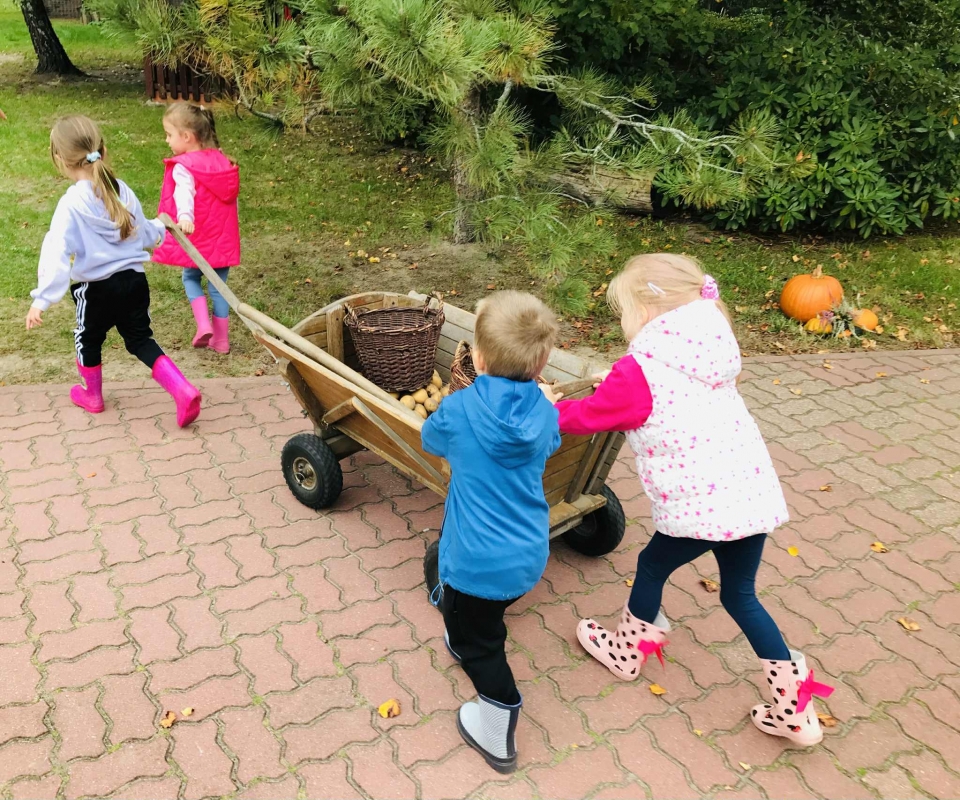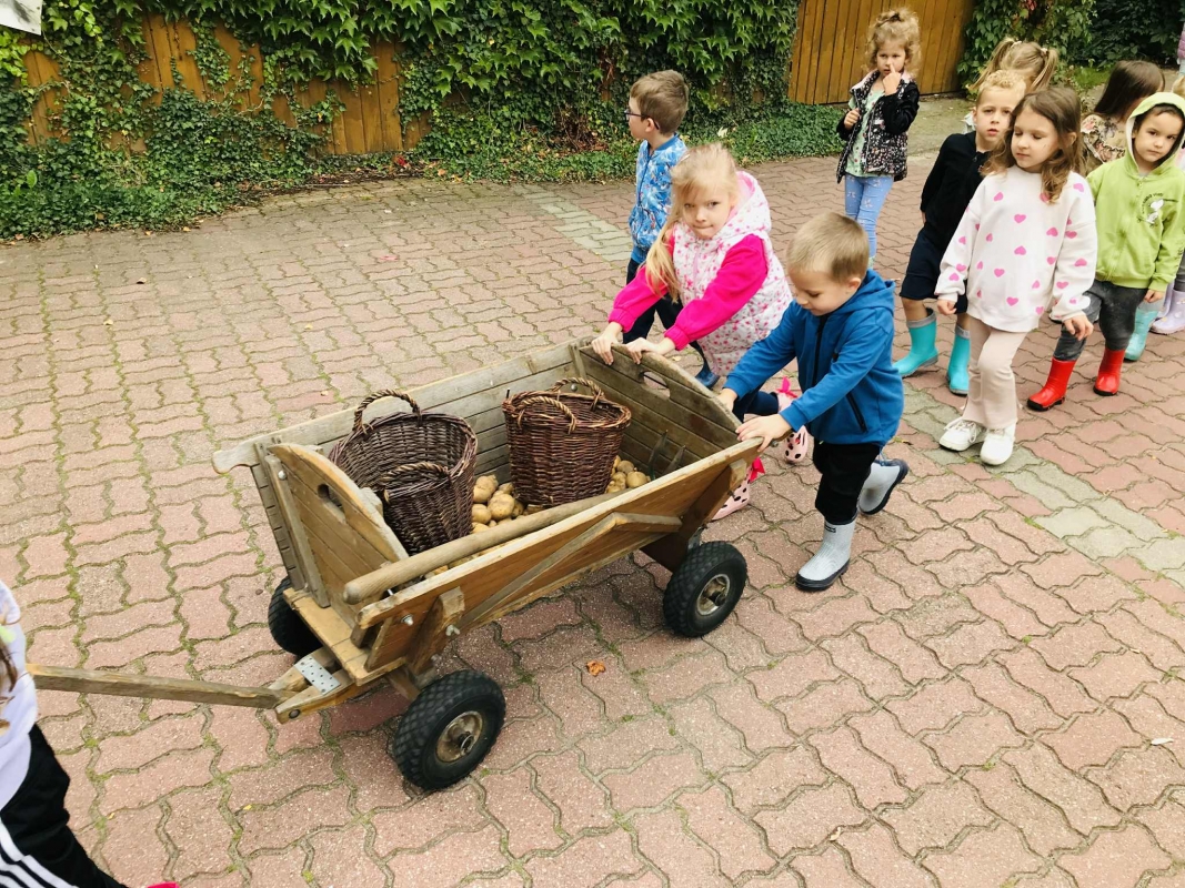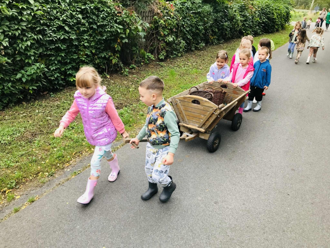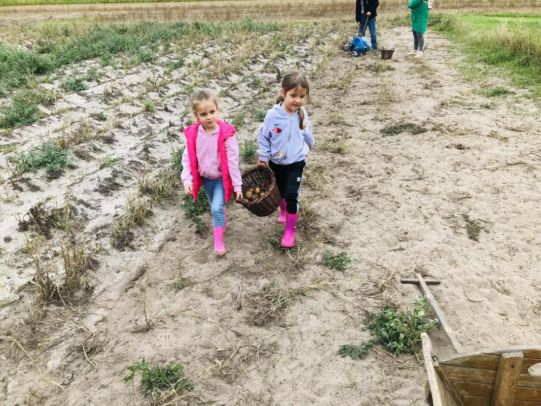22 września 2025 r. grupy Biedronek i Mrówek pojechały do Osady Agroturystycznej "Stajnia Lusi" w Konarzewie. Pogoda nam dopisała i humory także. Biedronki dowiedziały się jakie są tradycyjne sposoby robienia zapasów na zimę. Poznały pochodzenie i zalety dwóch warzyw: ziemniaka i kapusty. Po części teoretycznej przyszedł czas na praktykę czyli kopanie ziemniaków oraz szatkowanie i kiszenie kapusty, wszak "bez pracy nie ma kołaczy".  A po pracy na świeżym powietrzu apetyty się zaostrzyły i wtedy z prawdziwym smakiem przedszkolaki "wpałaszowały"  własnoręcznie ukopane, upieczone ziemnaczki z kiszoną kapustką i pysznym sosem śmietanowo - czosnkowym. Pycha, kto nie był, niech żałuje.