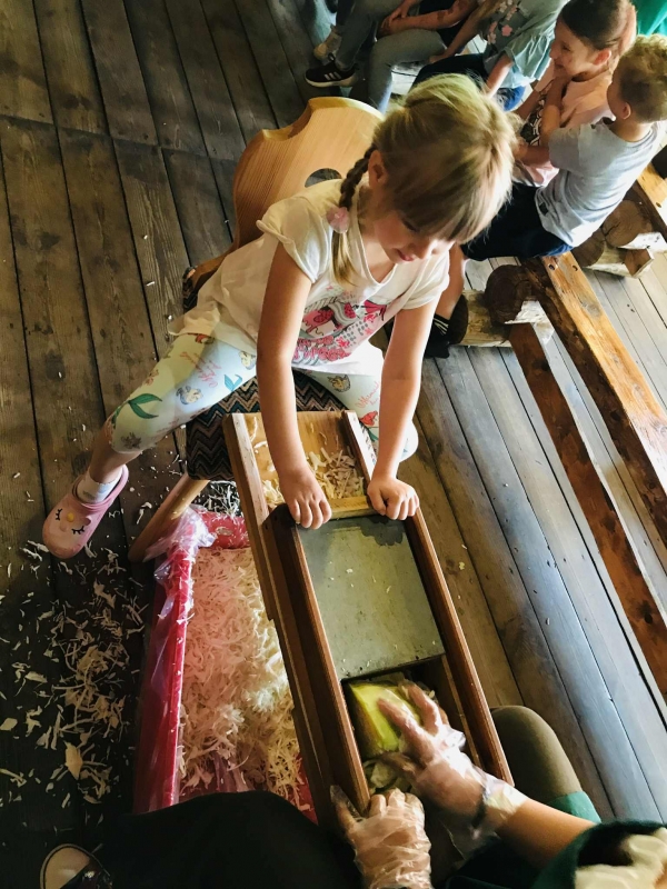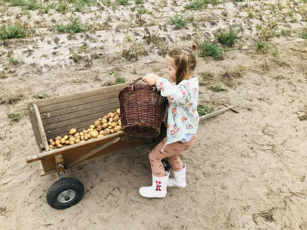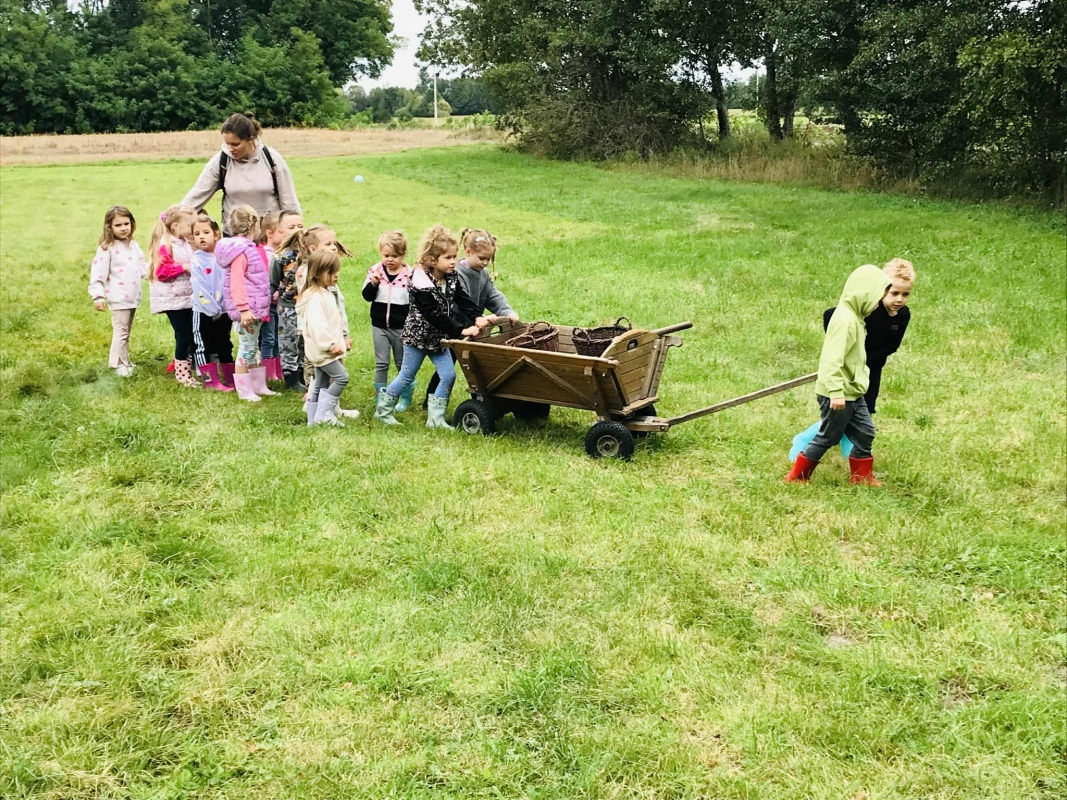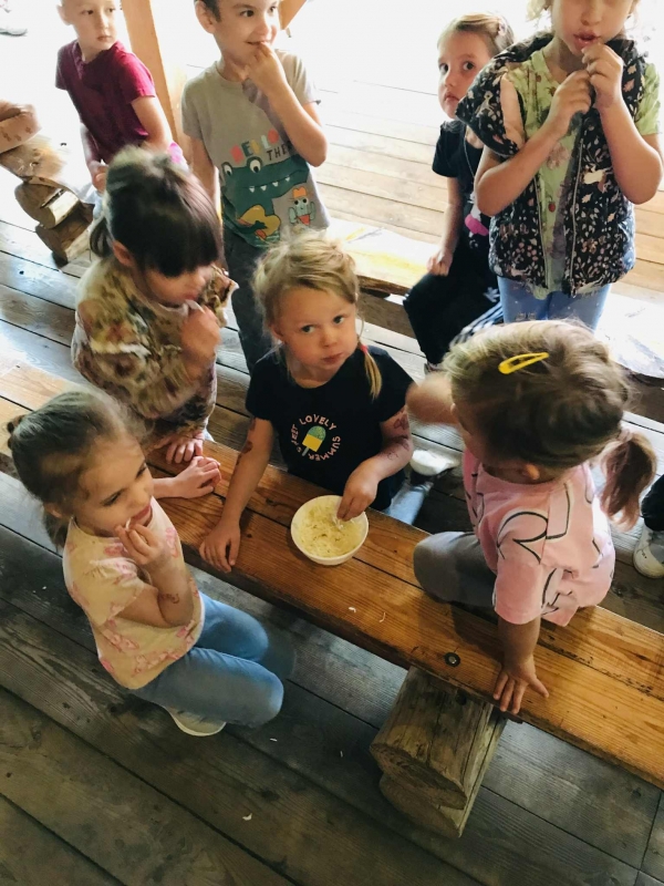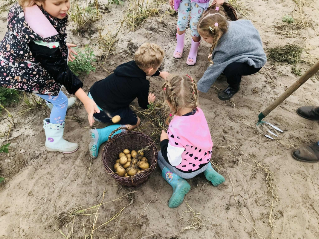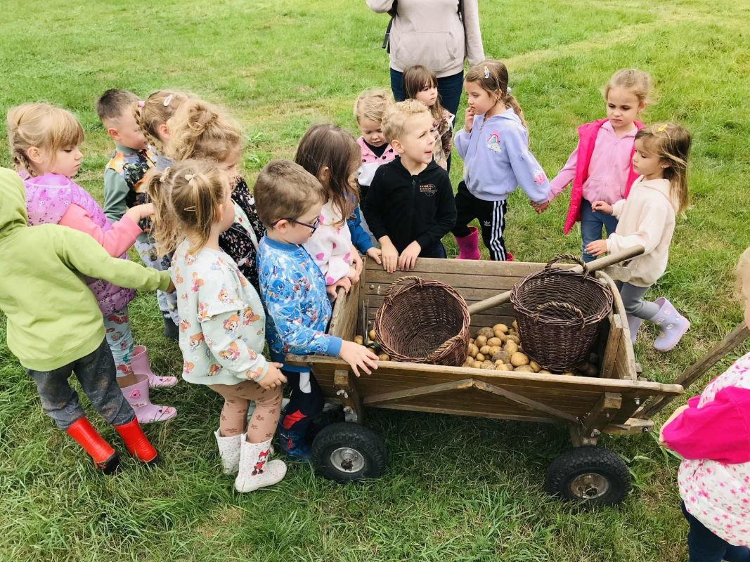 22 września 2025 r. grupy Biedronek i Mrówek pojechały do Osady Agroturystycznej "Stajnia Lusi" w Konarzewie. Pogoda nam dopisała i humory także. Biedronki dowiedziały się jakie są tradycyjne sposoby robienia zapasów na zimę. Poznały pochodzenie i zalety dwóch warzyw: ziemniaka i kapusty. Po części teoretycznej przyszedł czas na praktykę czyli kopanie ziemniaków oraz szatkowanie i kiszenie kapusty, wszak "bez pracy nie ma kołaczy".  A po pracy na świeżym powietrzu apetyty się zaostrzyły i wtedy z prawdziwym smakiem przedszkolaki "wpałaszowały"  własnoręcznie ukopane, upieczone ziemnaczki z kiszoną kapustką i pysznym sosem śmietanowo - czosnkowym. Pycha, kto nie był, niech żałuje.